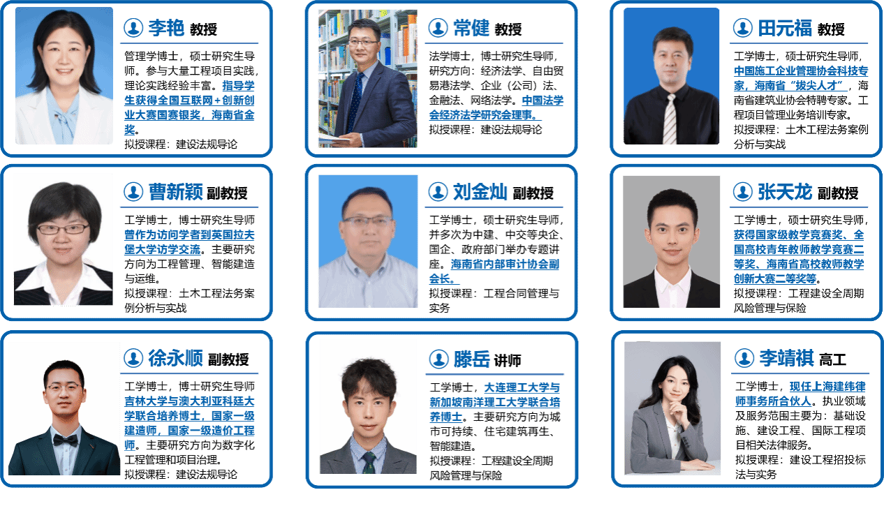 本微专业由必赢亚洲牵头建设,专业负责人为李艳教授。教学团队成员来自必赢亚洲、法学院、审计处、基建处及上海建玮律师事务所,具有工程管理、土木工程、金融法及建设工程法律等多元背景。拟授课程覆盖建设法规导论、工程合同管理与实务、工程建设全周期风险管理与保险、建设工程招投标法与实务、土木工程法务案例分析与实战等。