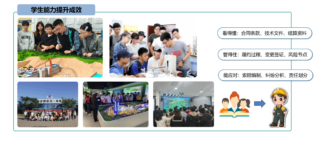 传统土木类人才培养更加重视技术训练,而对合同条款识读、变更签证审查、结算争议防范、质量安全责任划分、工期争议处理等能力培养相对不足。为此,本专业拟通过理论讲授与案例研讨相结合的方式,帮助学生掌握工程合同管理、工程变更签证、工程价款结算、质量与安全责任、工期争议和审计争议等核心风险点。